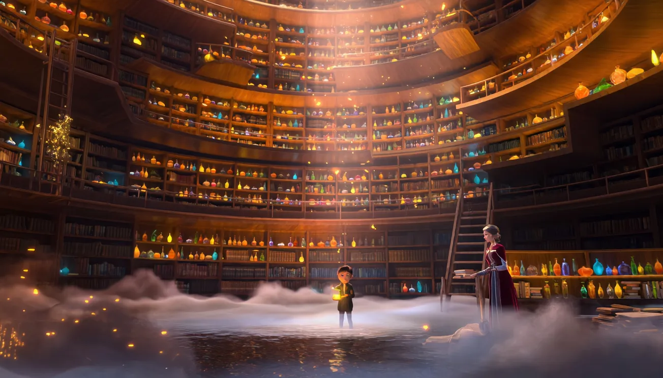 Endless shelves spiraled upward, filled with bottles—some glowing, some dim, all labeled in looping handwriting.